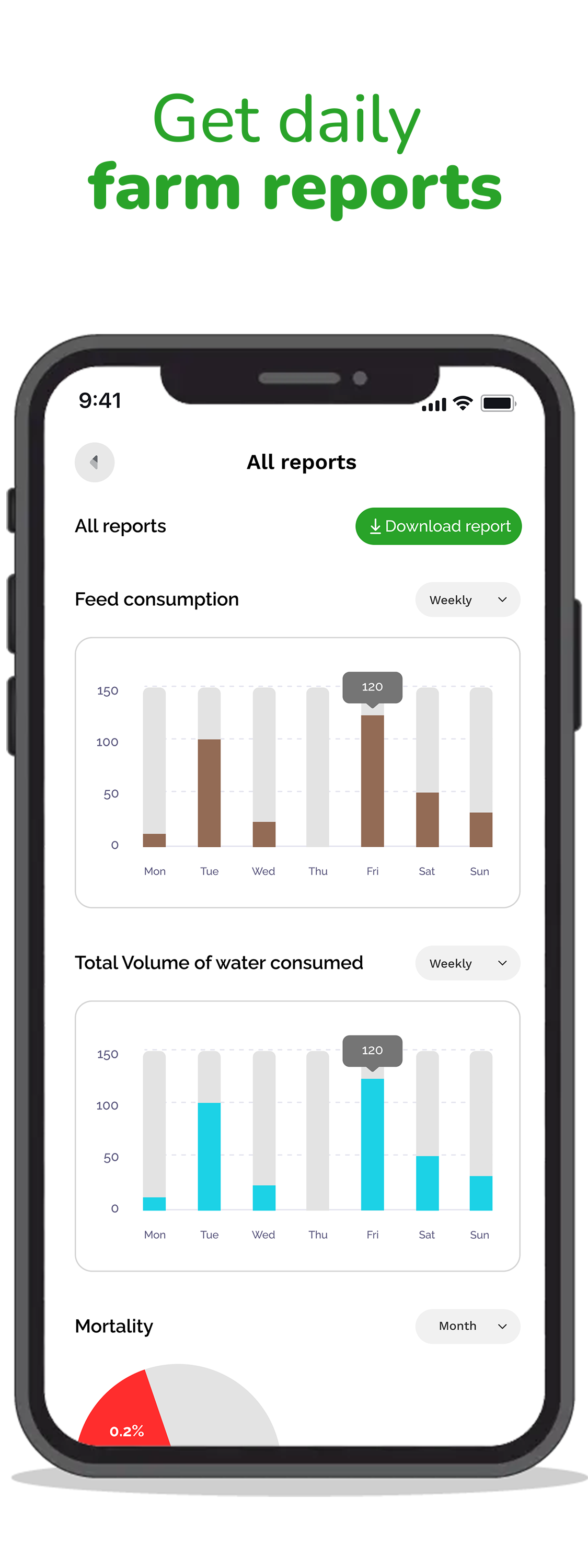 Monitor daily operations live — livestock counts, mortality, production, and income — all visualized in intuitive infographics updated in real time.