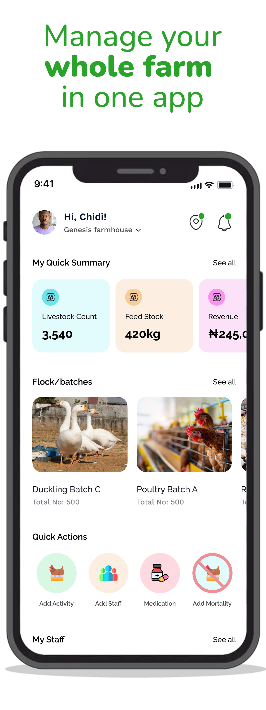 Record your animals, batches, and farm details. Add your staff with digital bio-data and NIN verification.